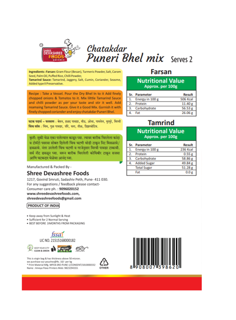 Farsan: Gram Flour (Besan), Turmeric Powder, Salt, Carom Seed, Palm Oil, Puffed Rice, Chilli Powder,