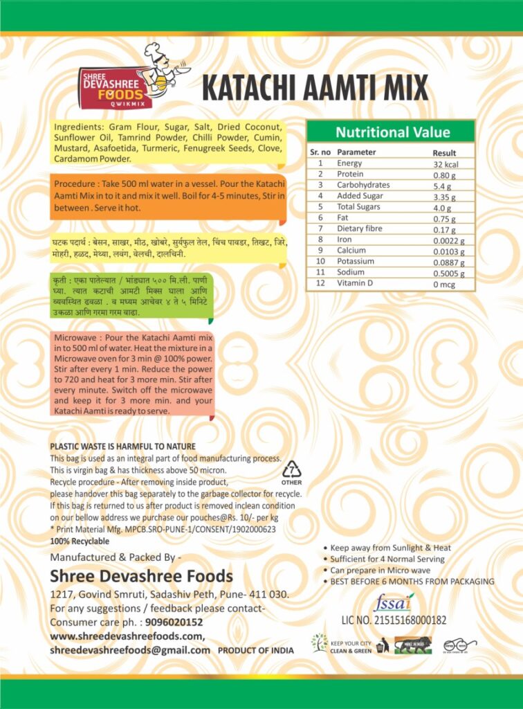Take 500 ml water in a vessel. Pour the Katachi Aamti Mix in to it and mix it well. Boil for 4-5 minutes, stir in between. Serve it hot.